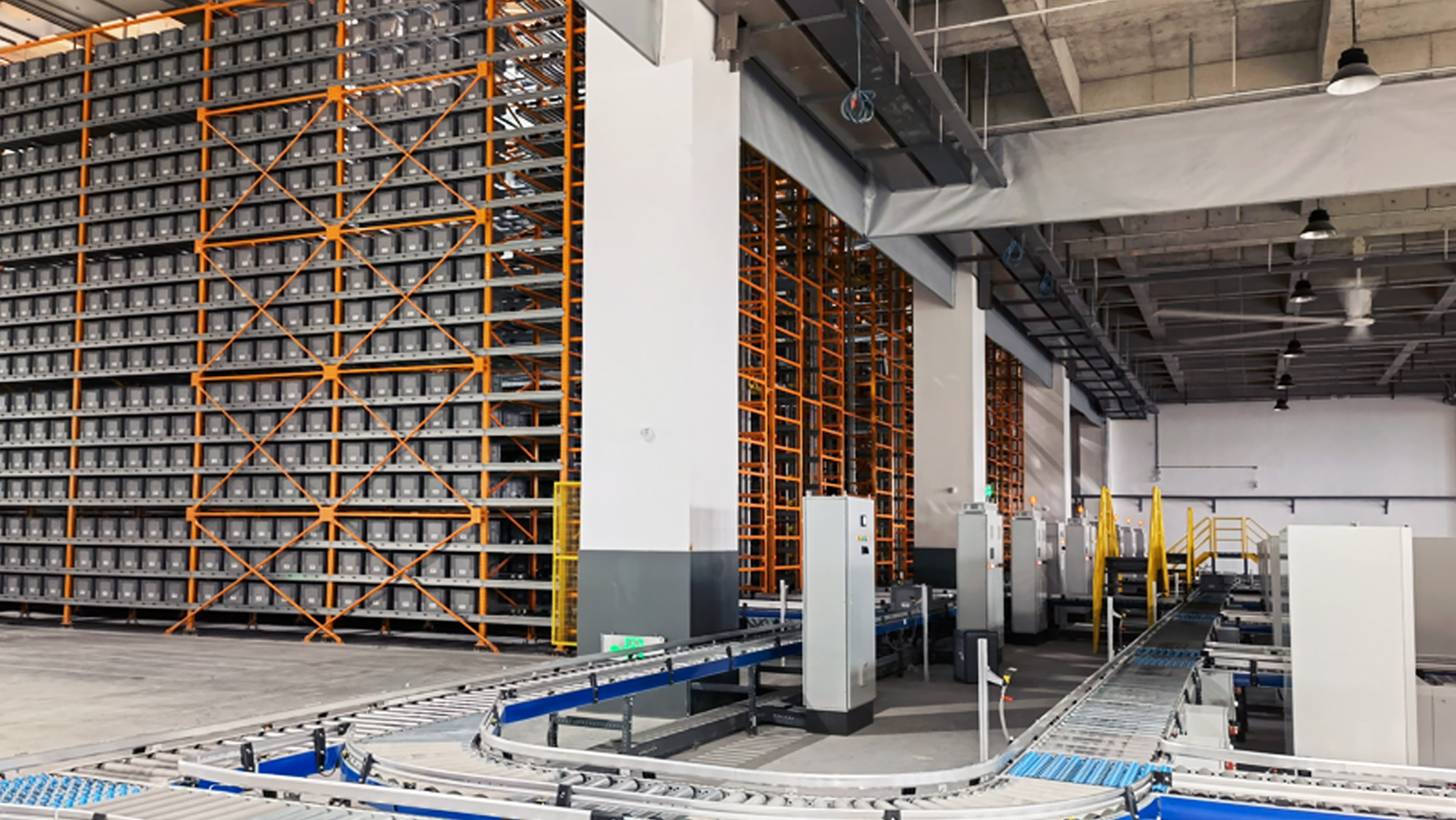 1樓為綜合收爆發(fā)業(yè)區(qū),妄想有多層穿梭車系統(tǒng),跨越兩層廠房,其空間使用率是通俗橫梁式貨架的1.5-2倍,整套多穿系總共計(jì)5.5萬個(gè)貨位。