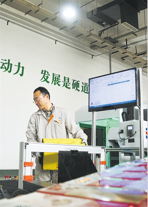 4月11日下晝4點,記者來到揚州市局(公司)卷煙物流配送中心,見到了已經(jīng)投入使用的“綠色三號”自動包裝裝備——占地約15平方米、高缺乏2米、噪音很小,卷煙自動疊成1~5層的小垛,由推桿推送到包裝裝備內(nèi)里,在裝備另一端,一個個狀如書包的煙包完成自動封包、自動貼標。